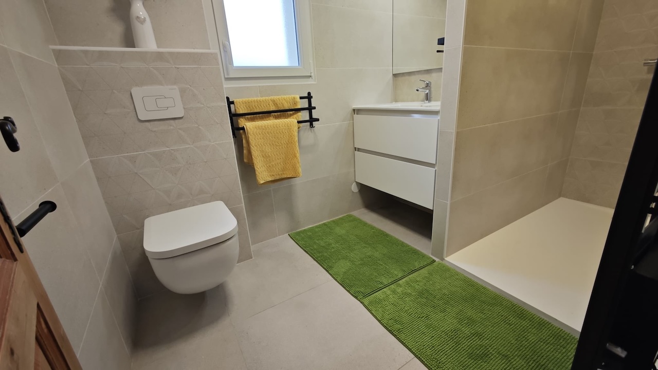 Im Erdgeschoss befinden sich 1 Schlafzimmer mit Doppelbett (2x90x200) mit Zugang zum eingezäunten Garten (1400m²) und Meeresblick, ein in 2026 renoviertes Badezimmer mit ital. Dusche(160x90) und Tageslicht, Eingangsbereich mit grossem Schreibtisch und Sofa sowie ein Raum mit Waschmaschine und Trockner sowie einem kleinen Gefrierschrank.