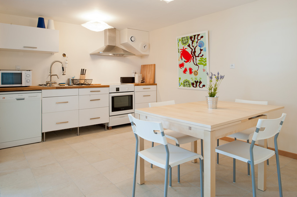 - ein Essbereich mit komplett ausgestatteter Küche (Herd, Spülmaschine, Filter-Kaffeemaschine, Wasserkocher, Mikrowelle, Kühl- und Gefrierschrank),