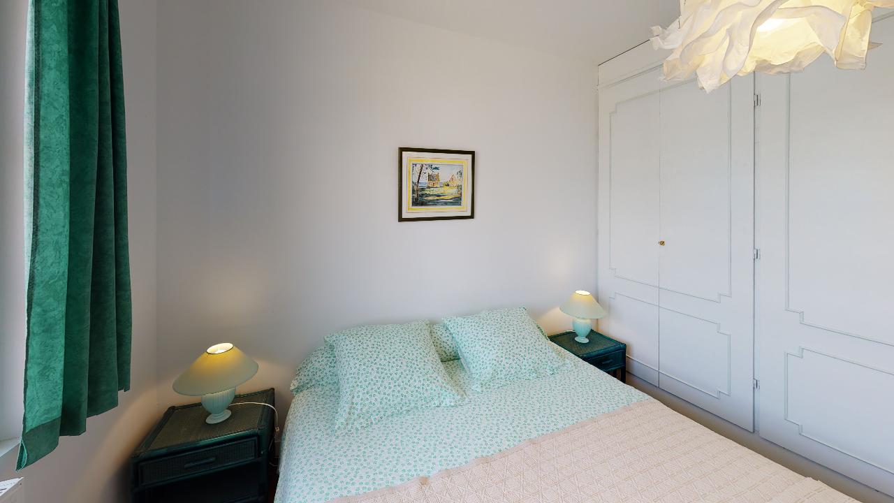 Ein Schlafzimmer mit einem Bett von 160x200. Ein grosser Einbauschrank ist vorhanden. Nebenan ein Badezimmer mit italienischer Dusche und Waschbecken.